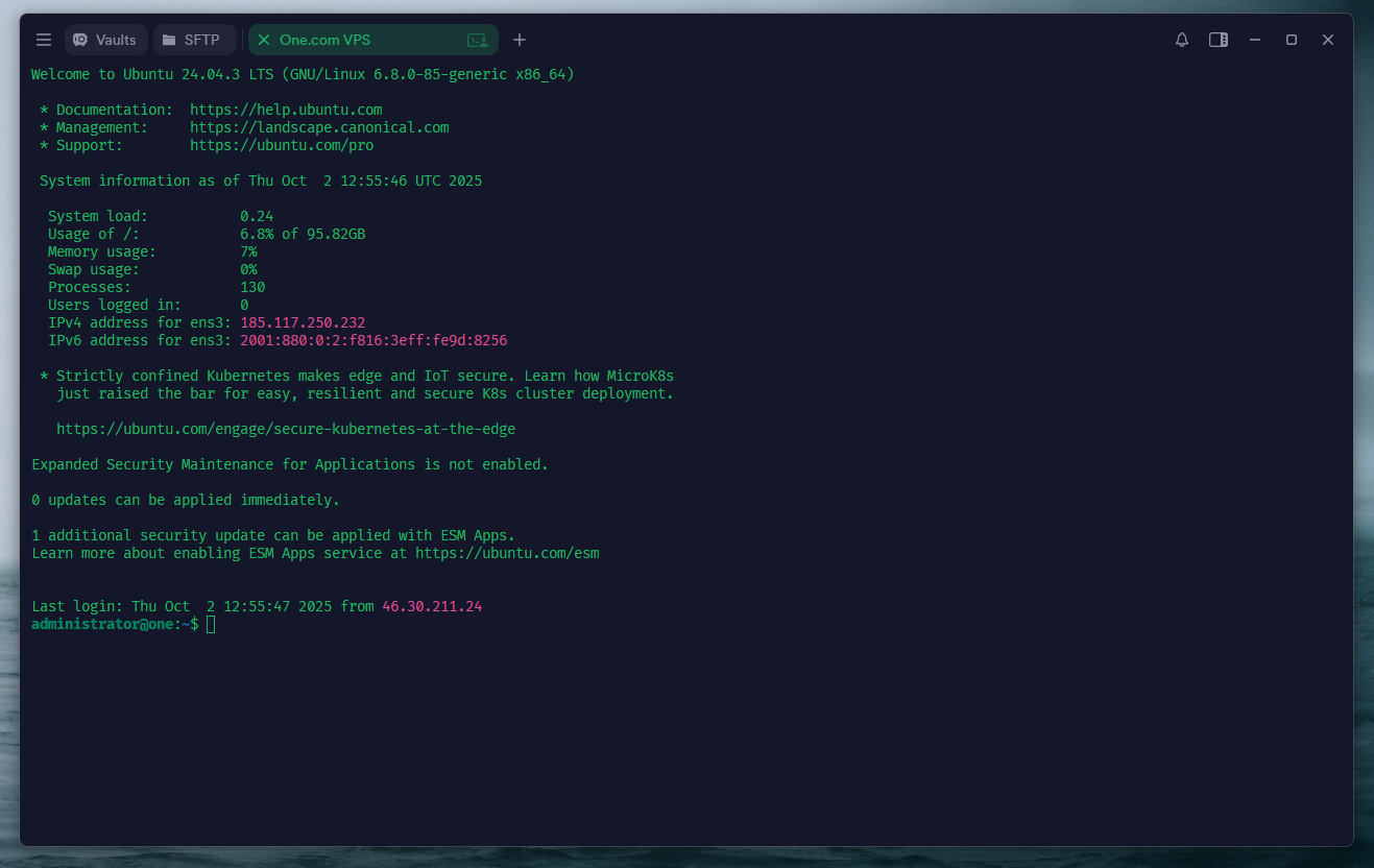 You manage your websites and email via Plesk. And we make sure your server is updated. You have no access to the console of the server, and cannot install anything else.